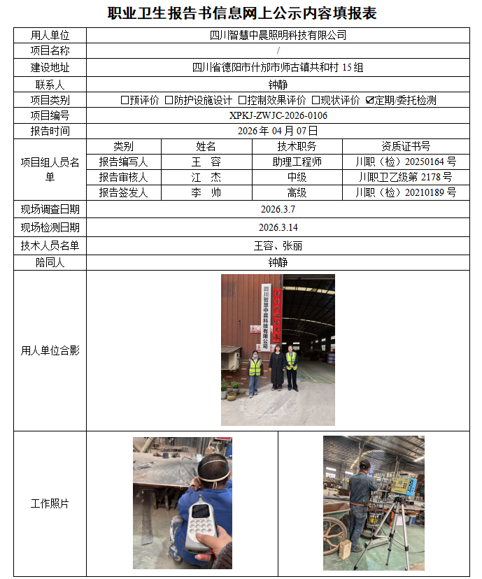四川智慧中晨照明科技有限公司职业病危害因素定期检测