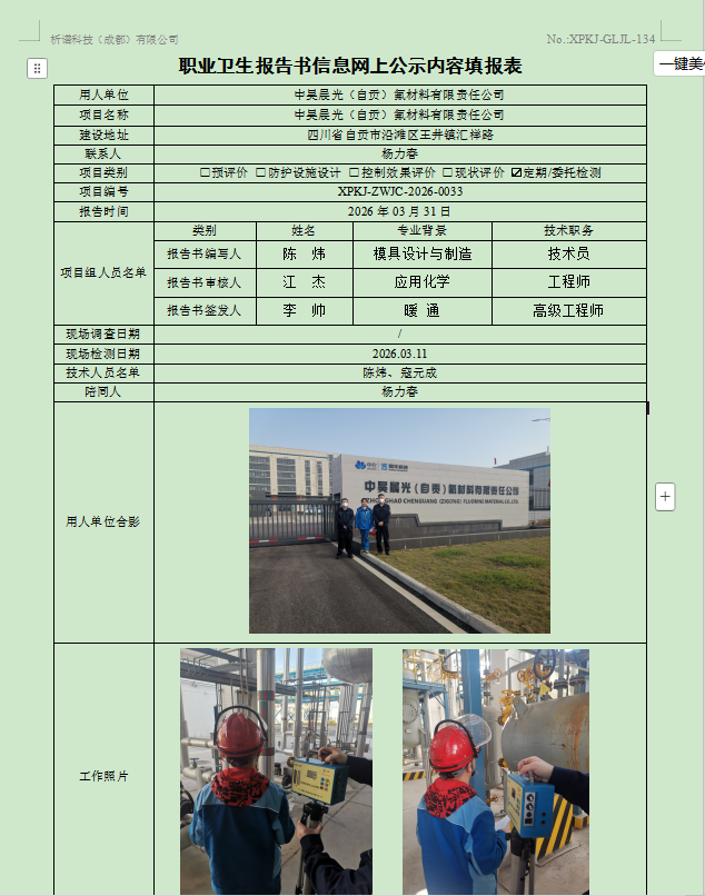 中昊晨光(自贡)氟材料有限责任公司职业病危害因素委托检测