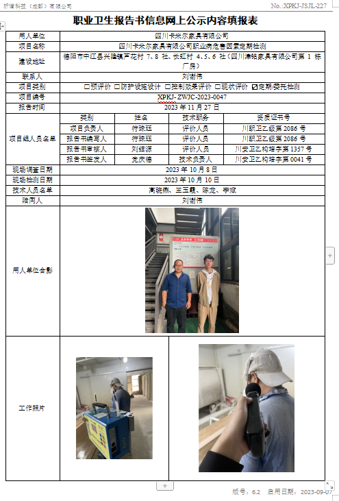 四川卡米尔家具有限公司职业病危害因素定期检测