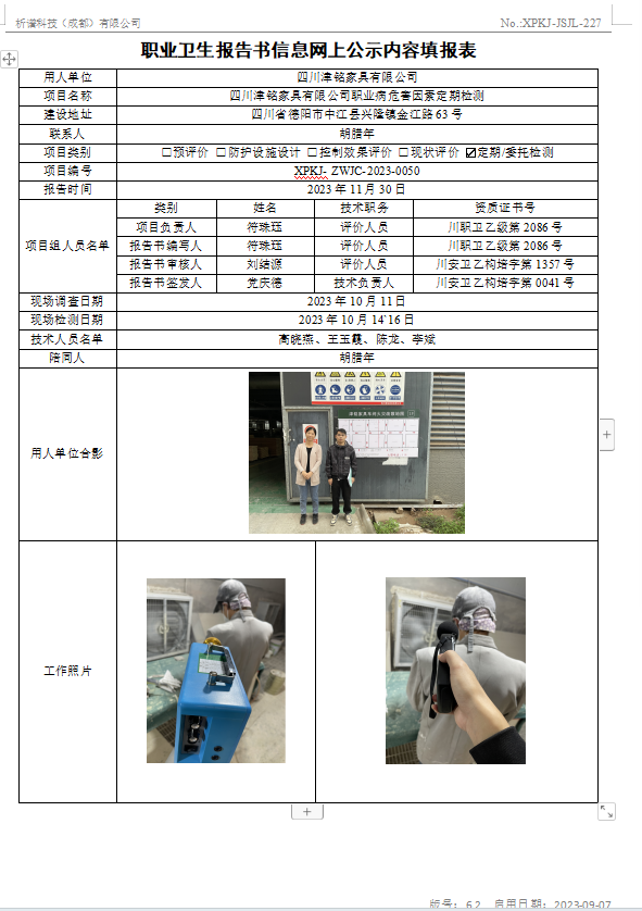 四川卡米尔家具有限公司职业病危害因素定期检测