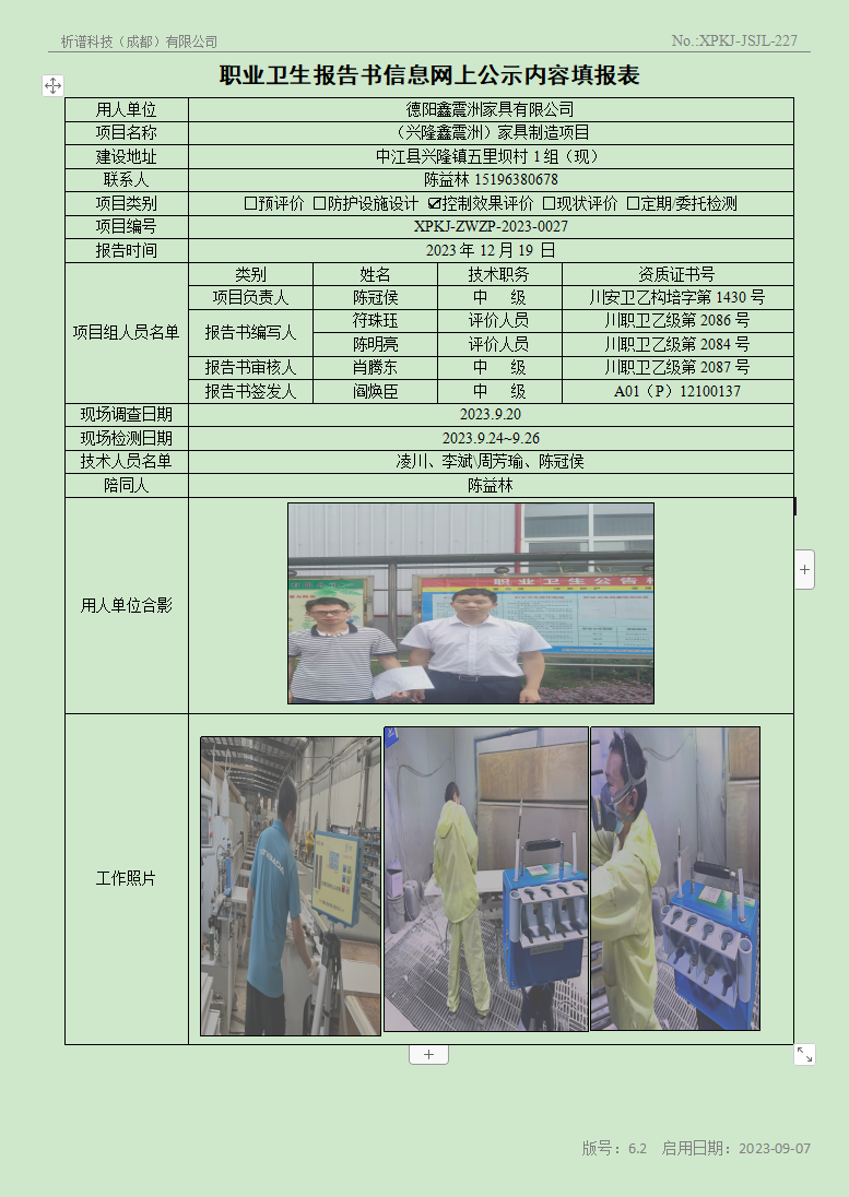 德阳鑫震洲家具有限公司职业病危害控制效果评价