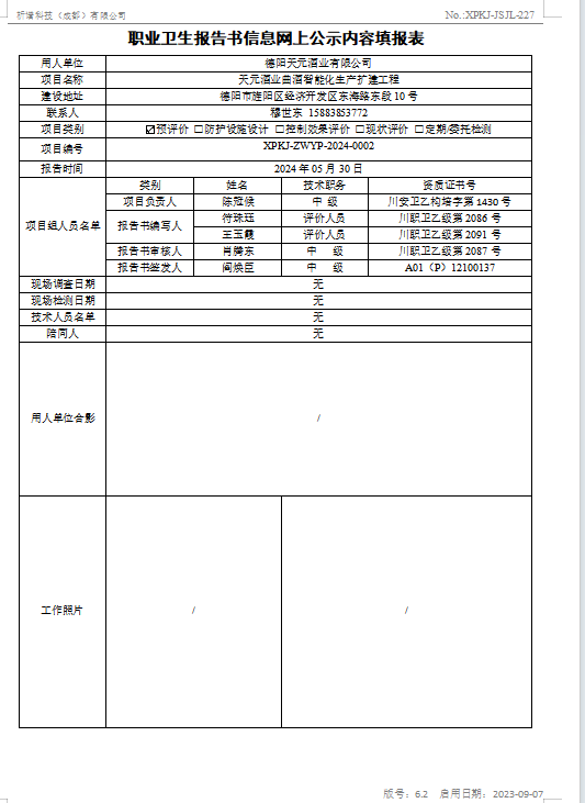 德阳天元酒业有限公司天元酒业曲酒智能化生产扩建工程职业病危害预评价