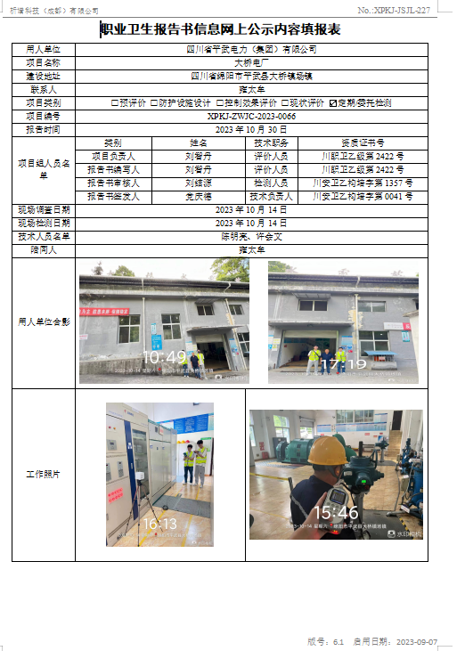 四川省平武电力(集团)有限公司大桥电厂职业病危害因素定期检测