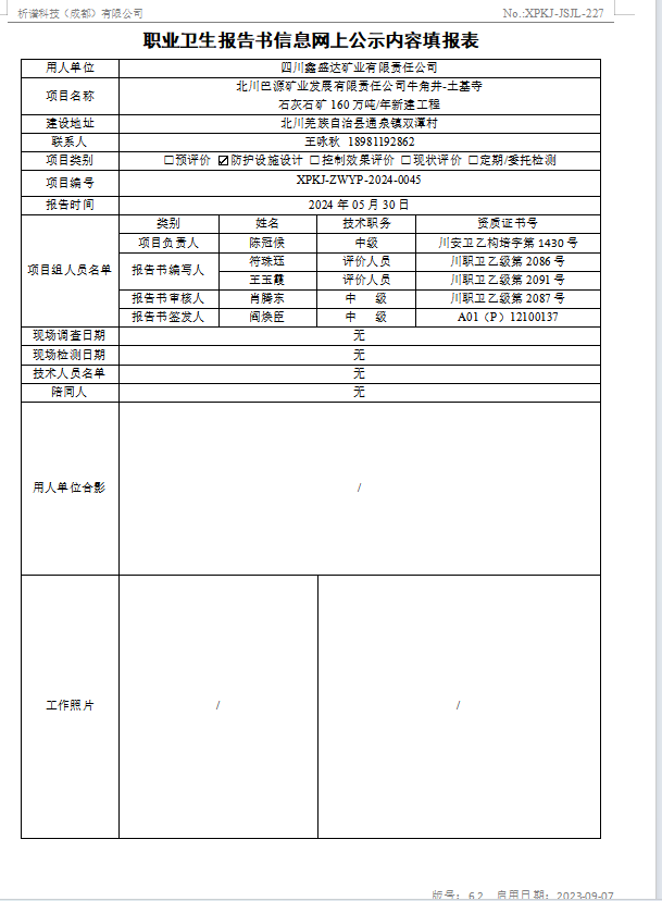 四川鑫盛达矿业有限责任公司北川巴源矿业发展有限责任公司牛角井-土基寺 石灰石矿160万吨/年新建工程职业病危害预评价