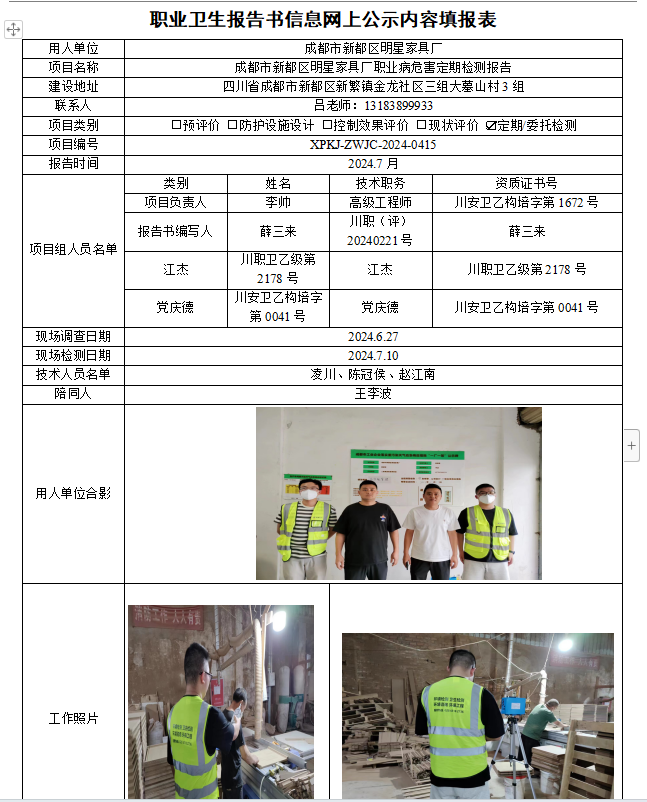 成都市新都区明星家具厂定期检测