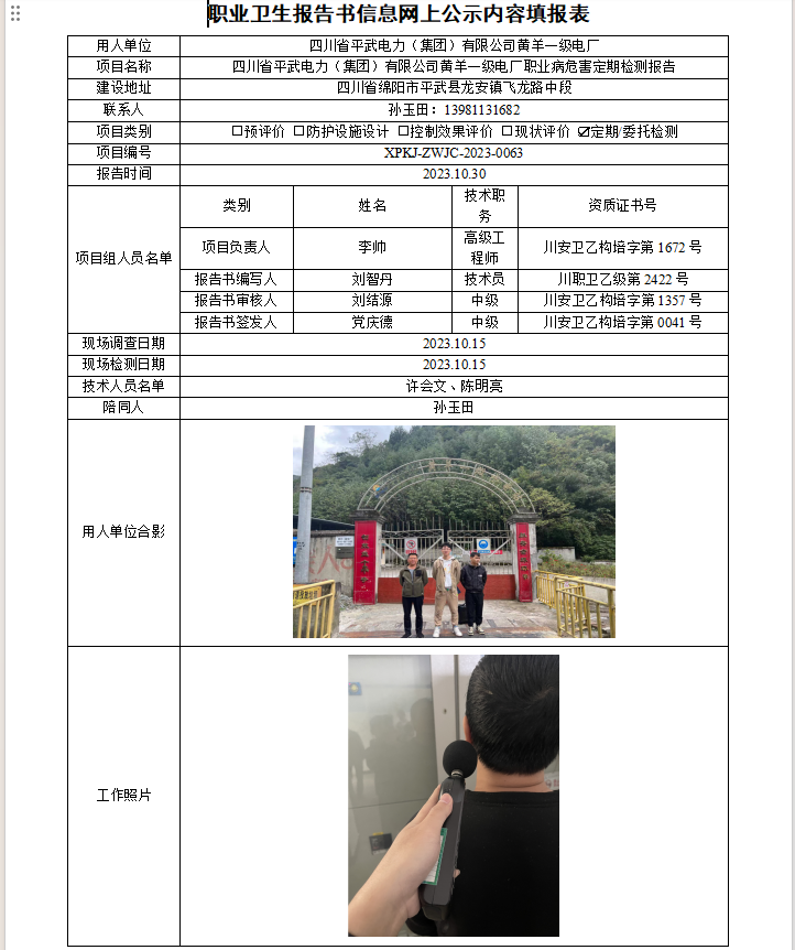 四川平武电力(集团)有限公司黄羊一级电厂定期检测