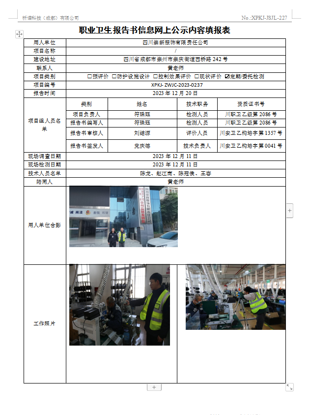 四川普惠达新材料科技有限公司职业病危害因素定期检测