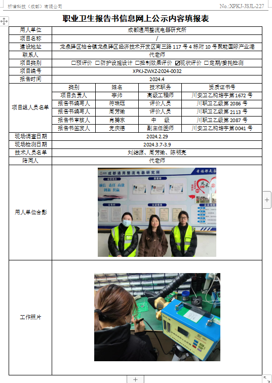 西南化工研究设计院有限公司双流分公司职业病危害因素定期检测
