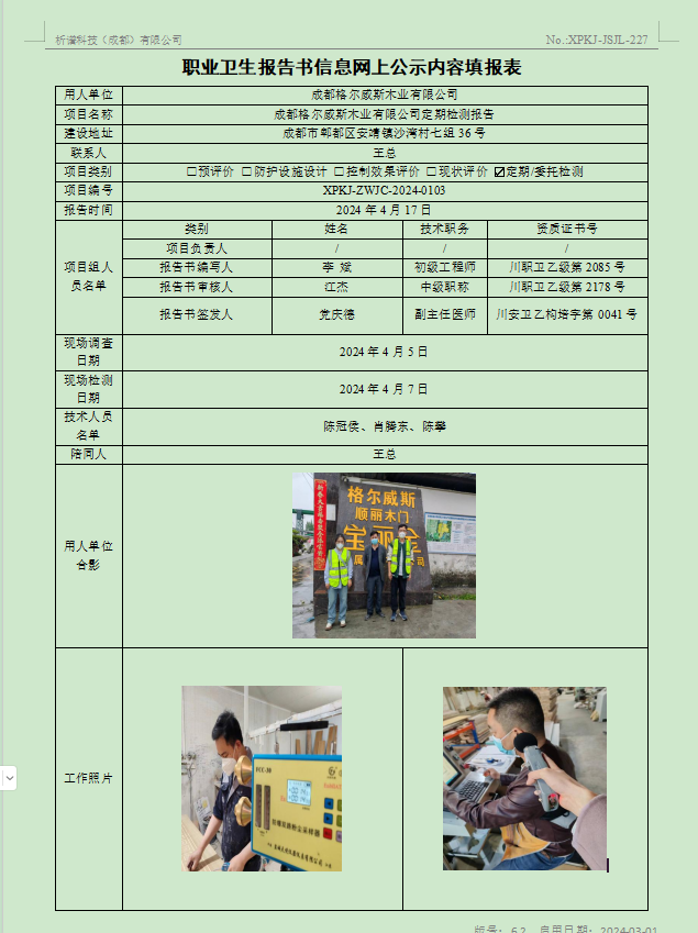 成都格尔威斯木业有限公司定期检测