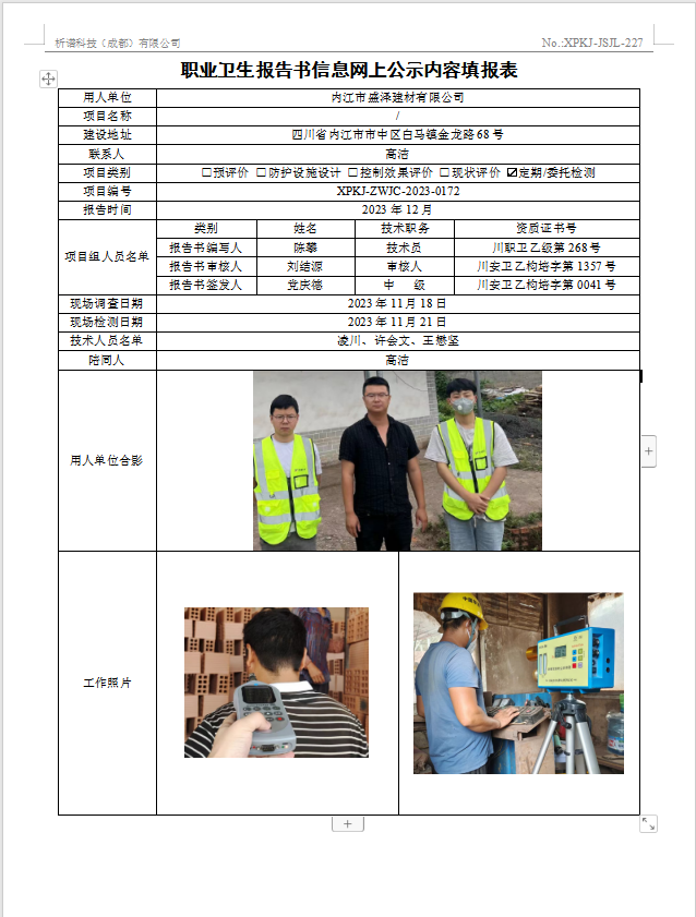 成都欧格莱家具有限公司职业病危害因素定期检测