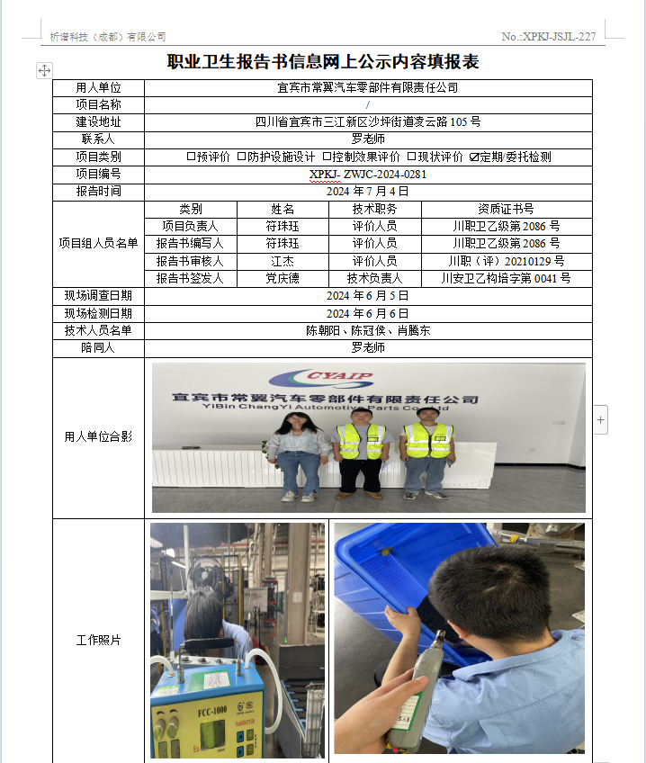 宜宾市常翼汽车零部件有限责任公司定期检测