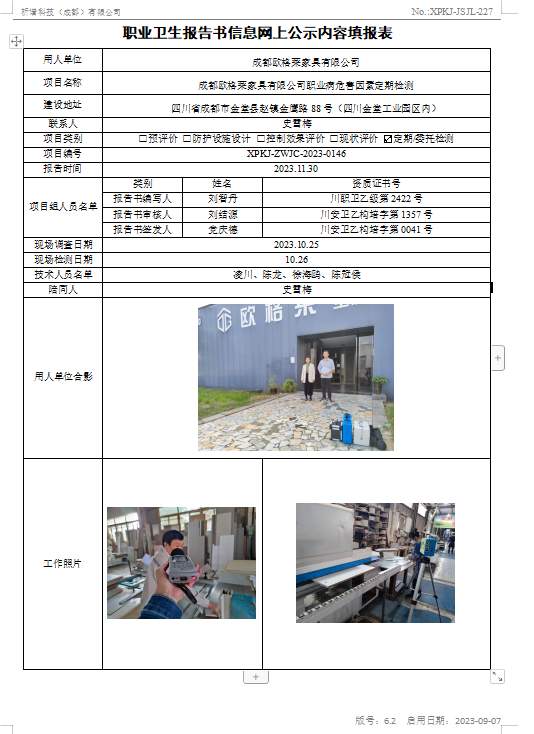 成都欧格莱家具有限公司职业病危害因素定期检测