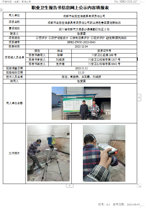 成都市名扬世佳家具有限责任公司职业病危害因素定期检测
