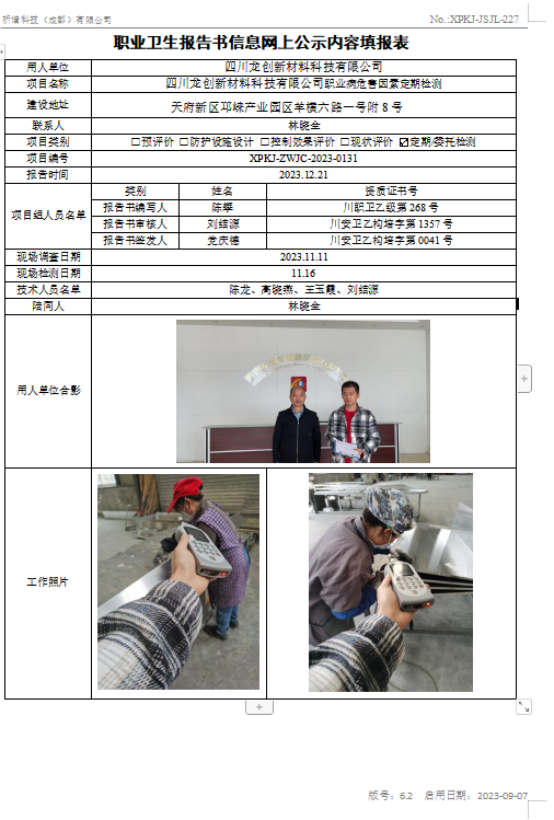 四川龙创新材料科技有限公司职业病危害因素定期检测