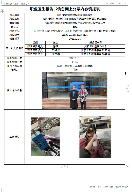 四川普惠达新材料科技有限公司职业病危害因素定期检测