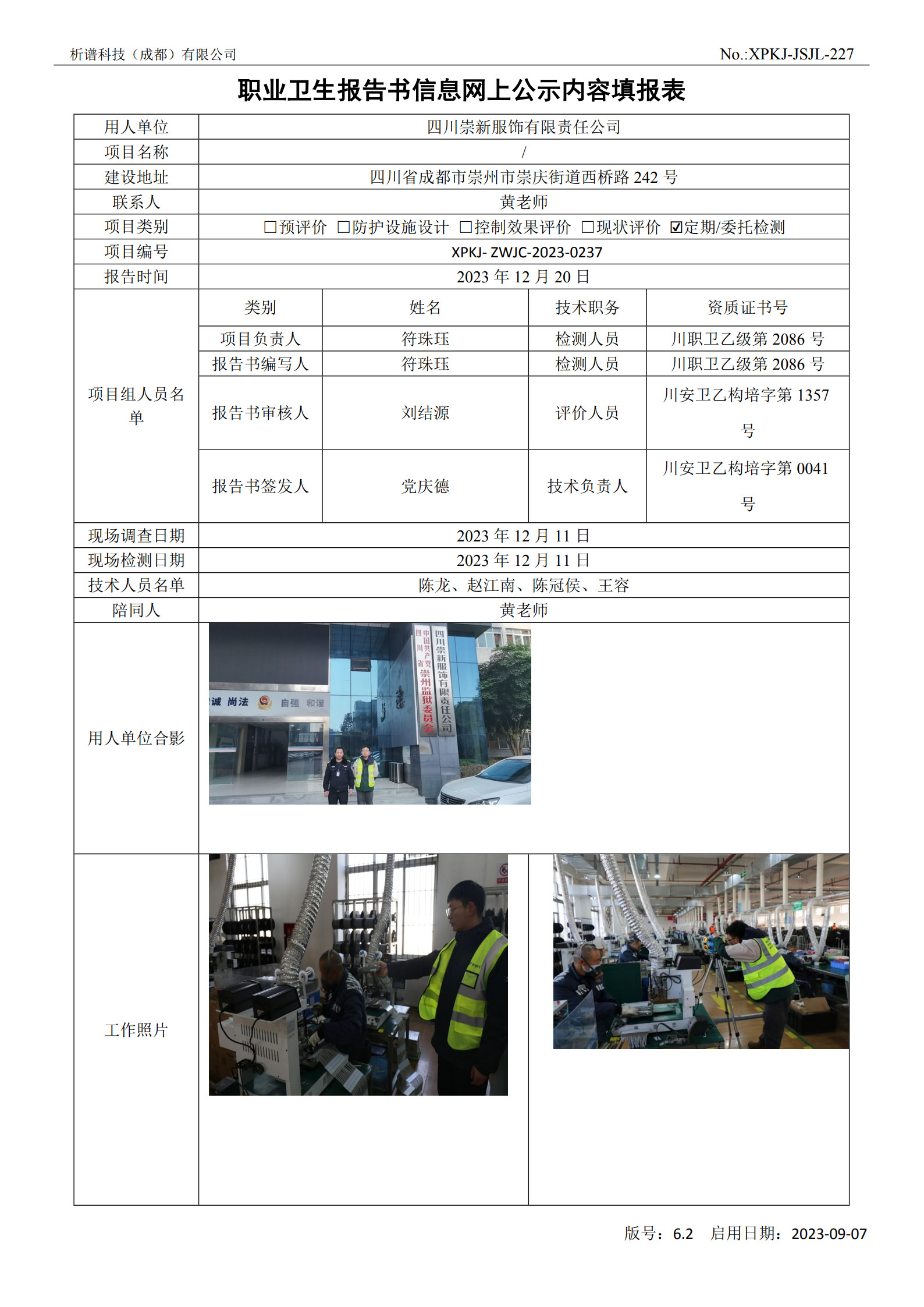 四川崇新服饰有限责任公司定期检测