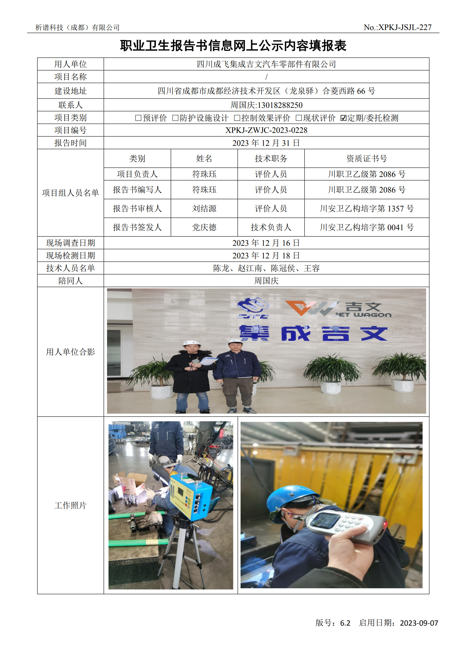 四川成飞集成吉文汽车零部件有限公司定期检测