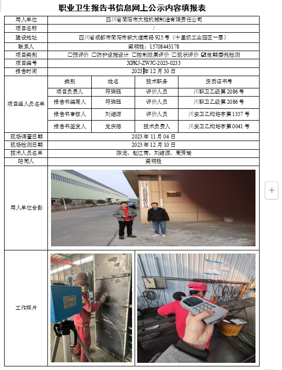 四川省简阳市大胜机械制造有限公司定期检测