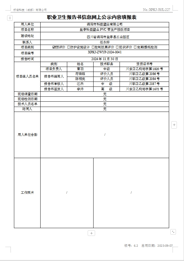绵阳市科益塑业有限公司职业病危害因素预评价