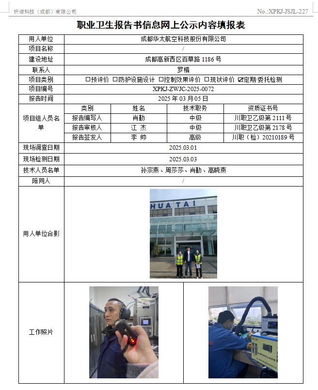 成都华太航空科技股份有限公司职业病危害定期检测