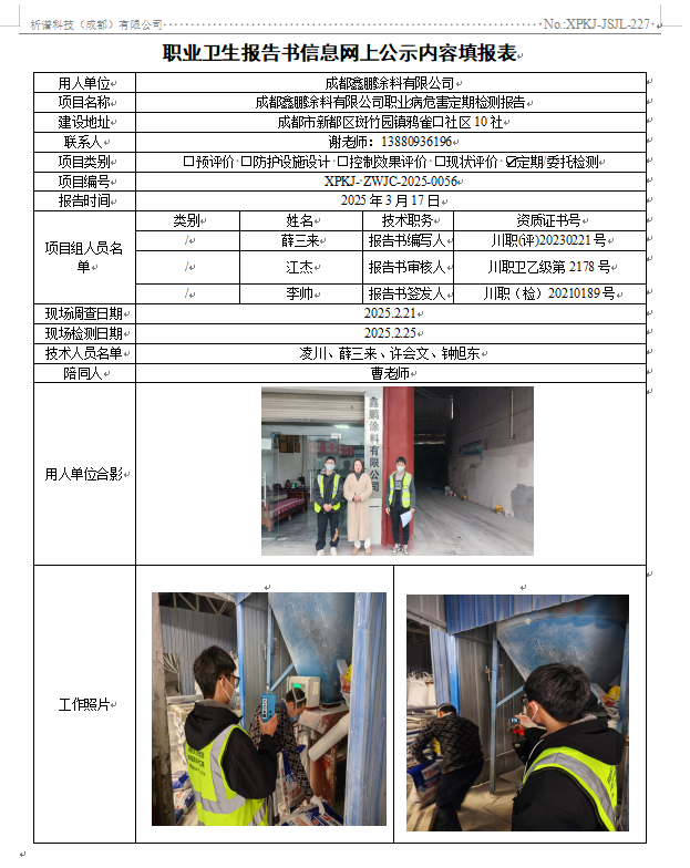 成都鑫鹏涂料有限公司职业病危害因素定期检测