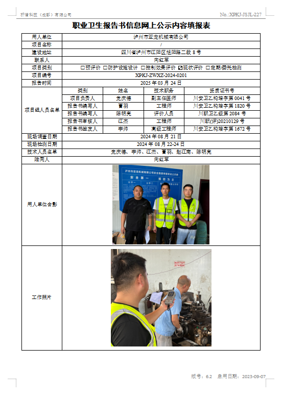 泸州市亚龙机械有限公司职业病危害因素现状评价