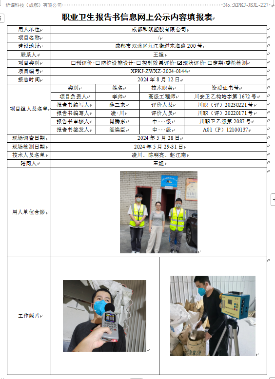 成都和隆塑胶有限公司职业病危害因素现状评价
