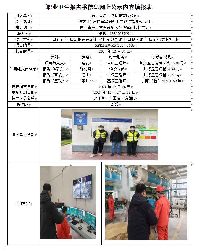 乐山巨星生物科技有限公司职业病危害因素控制效果评价