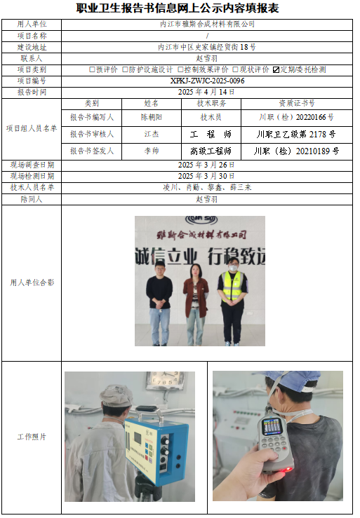 内江市雅斯合成材料有限公司职业病危害因素定期检测