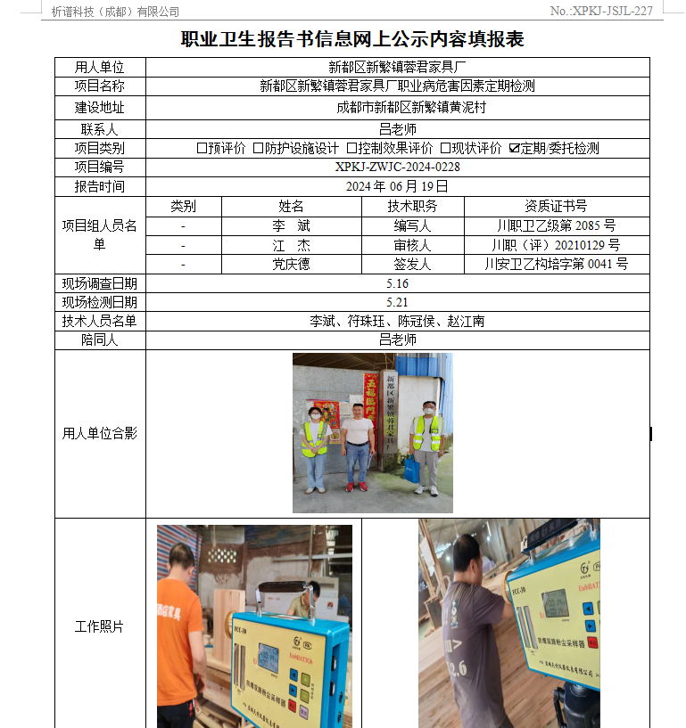 新都区新繁镇蓉君家具厂职业病危害因素定期检测