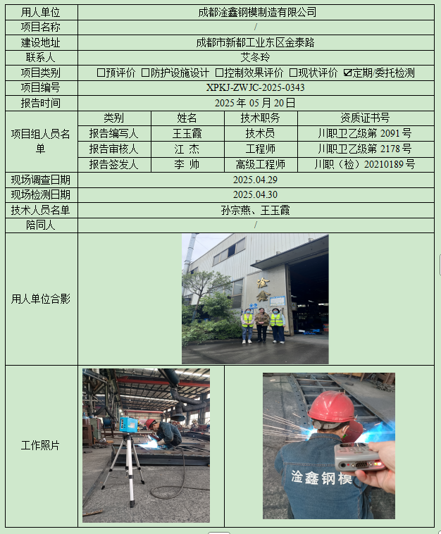 成都淦鑫钢模制造有限公司职业病危害因素定期检测