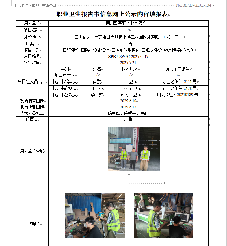 四川欧斐雅木业有限公司职业病危害因素定期检测