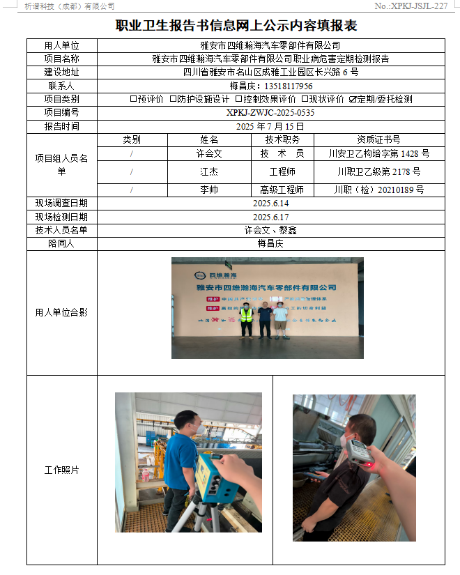 雅安市四维瀚海汽车零部件有限公司职业病危害因素定期检测
