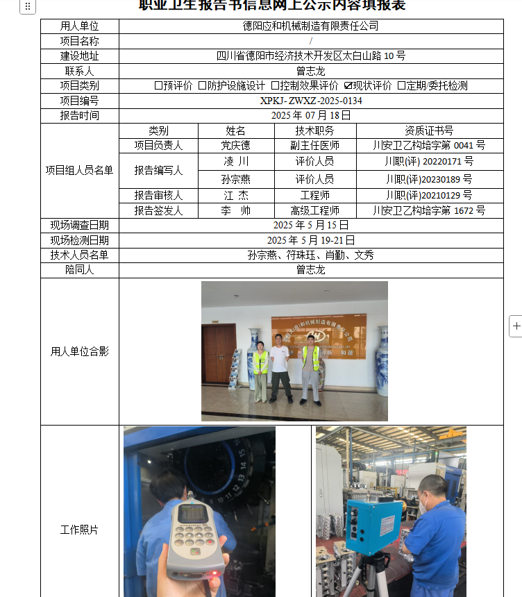 德阳应和机械制造有限责任公司职业病危害因素现状评价