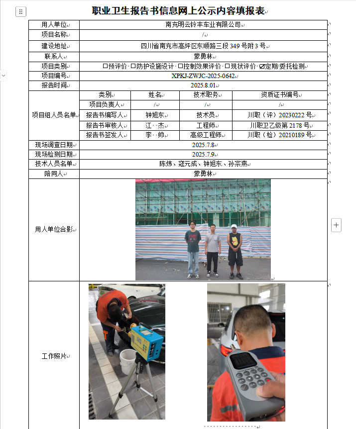 南充明云铃丰车业有限公司职业病危害因素定期检测