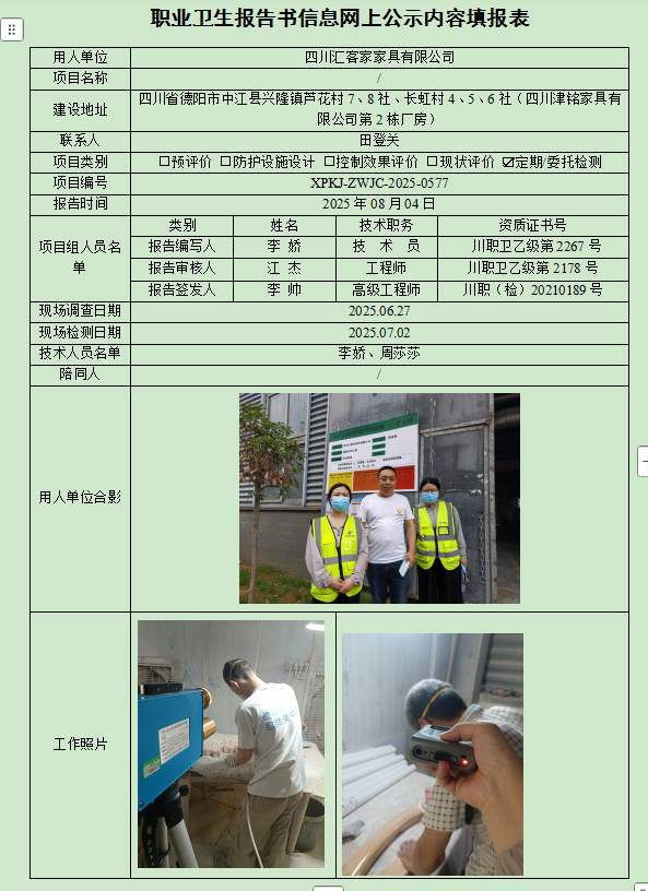 四川彭山鑫卓家具有限公司职业病危害因素定期检测