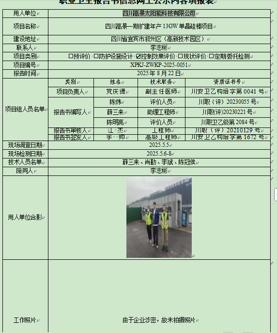 四川高景太阳能科技有限公司职业病危害因素控制效果评价