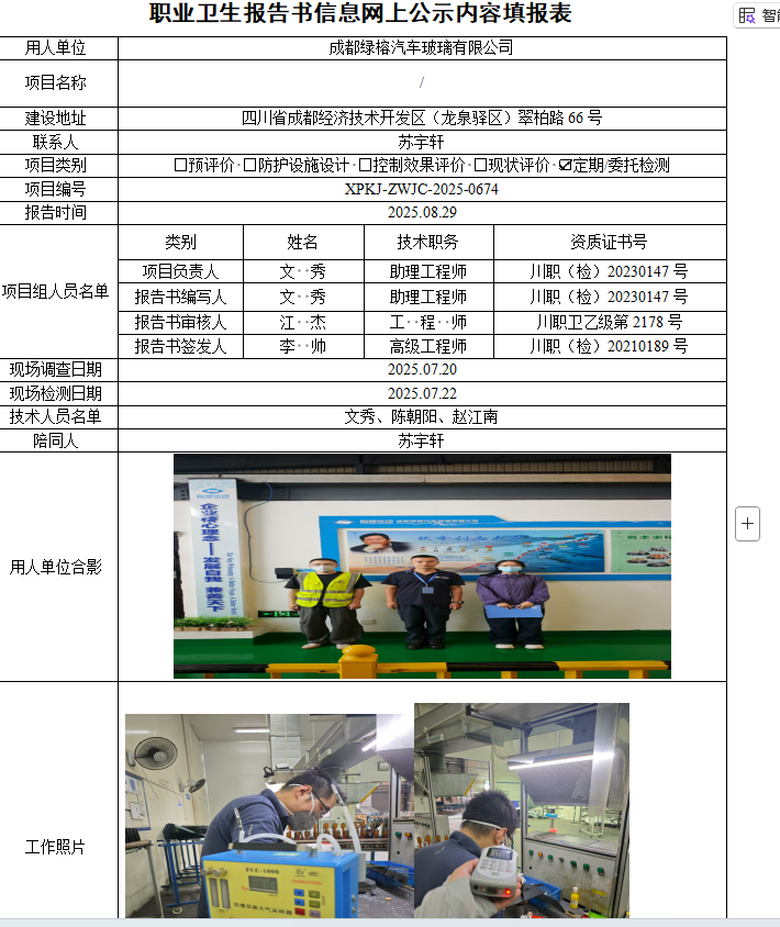 成都绿榕汽车玻璃有限公司职业病危害因素定期检测