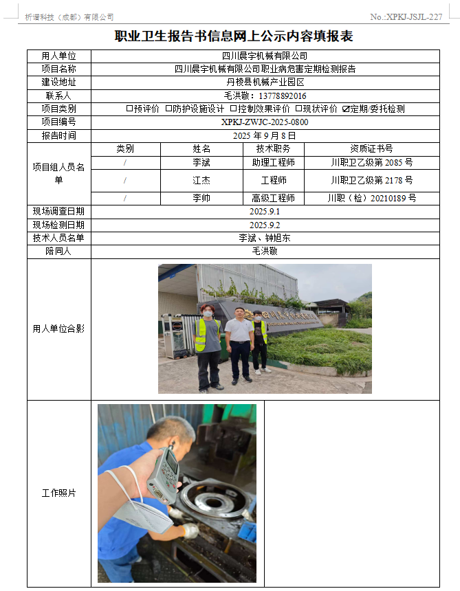 四川晨宇机械有限公司职业病危害因素定期检测