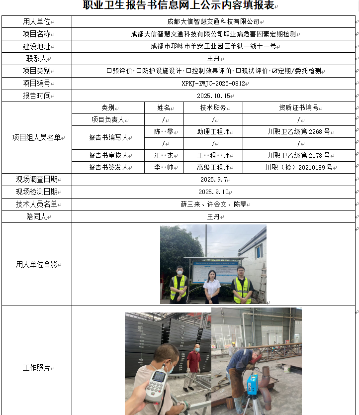 成都大信智慧交通科技有限公司职业病危害因素定期检测
