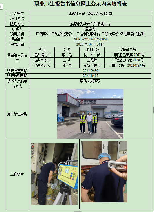 成都红紫荆包装印务有限公司职业病危害因素定期检测