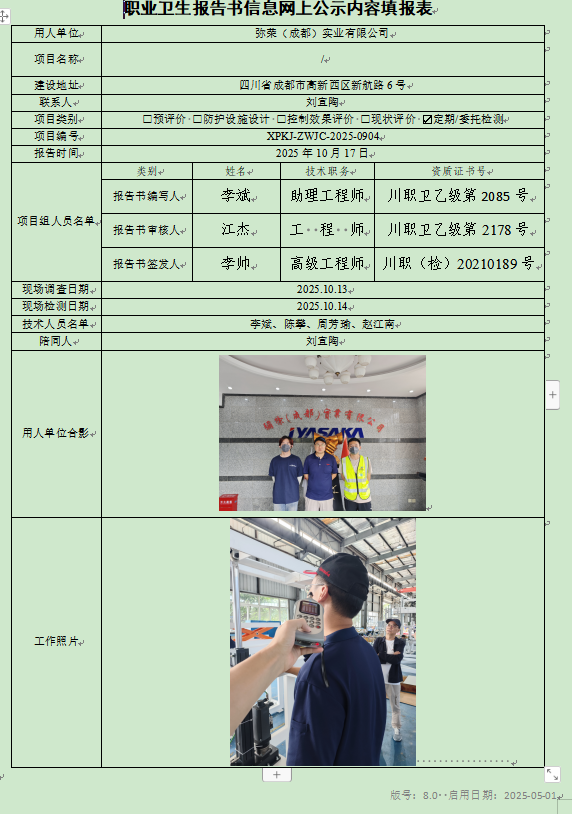 弥荣(成都)实业有限公司职业病危害因素定期检测