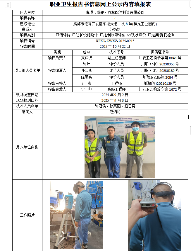 浦项(成都)汽车配件有限公司职业病危害因素现状评价