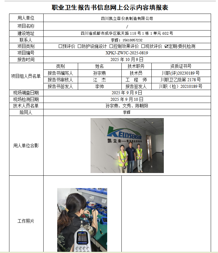 四川凯立森仪表制造有限公司职业病危害因素定期检测