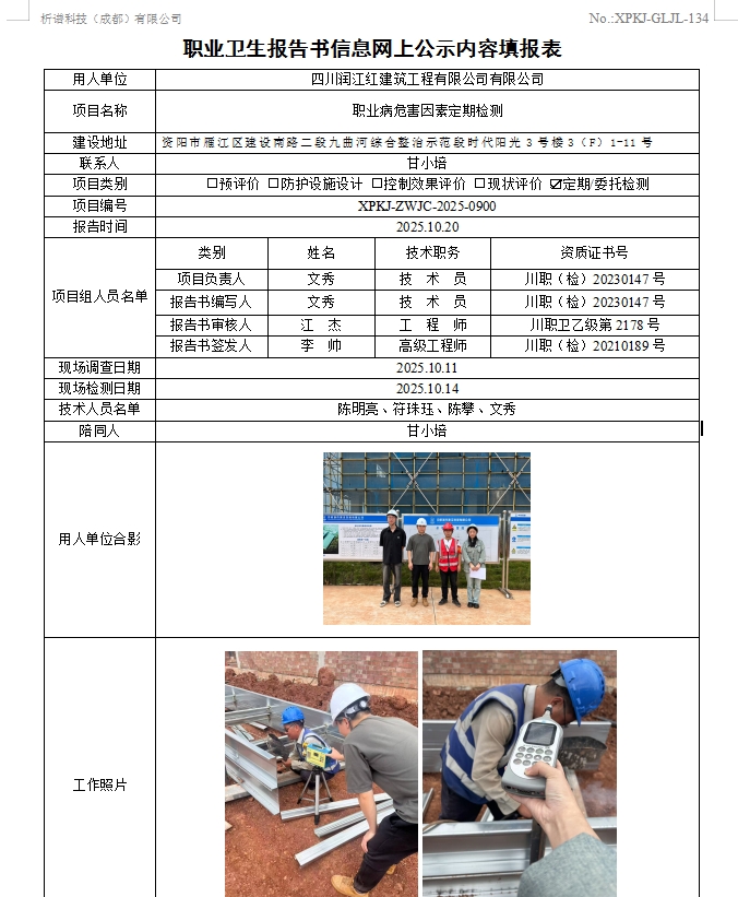 四川润江红建筑工程有限公司有限公司职业病危害因素定期检测
