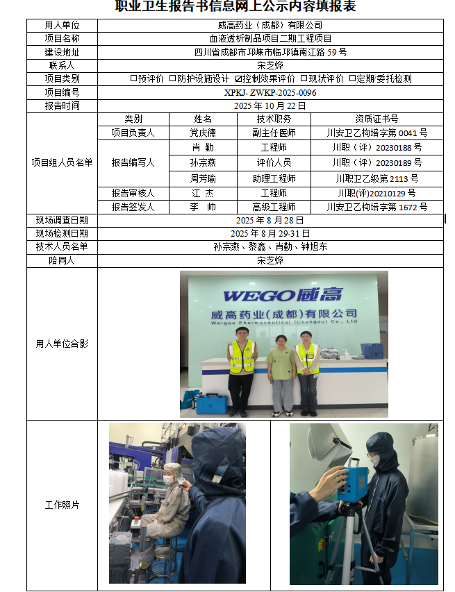 威高药业(成都)有限公司职业病危害因素控制效果评价
