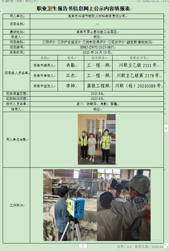 宜宾市兴诺节能耐火材料有限责任公司职业病危害因素定期检测