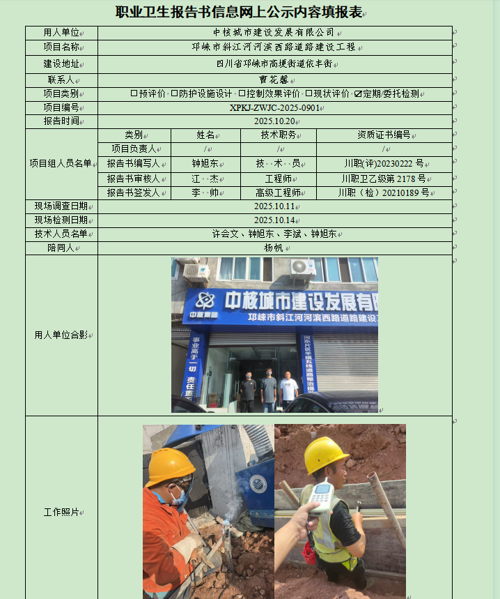 中核城市建设发展有限公司邛崃市斜江河河滨西路道路建设工程职业病危害因素定期检测