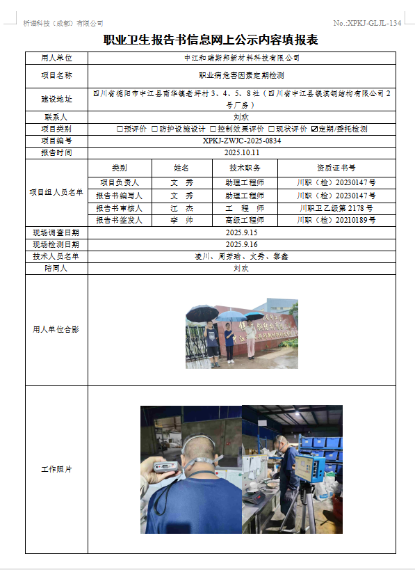 中江和瑞斯邦新材料科技有限公司职业病危害因素定期检测