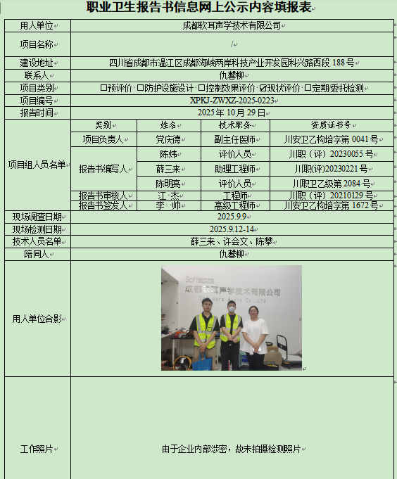 成都软耳声学技术有限公司职业病危害因素现状评价